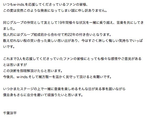 在w-inds.成軍19周年的這個時機宣布此消息,對支持w-inds.的粉絲及周圍的工作人員們都感到很抱歉,精神不安定的狀況已持續了好幾年,雖然考慮過繼續活動下去對於w-inds.crew來說可能是令人開心的事,但認真思考後還是做出了離開的決定。