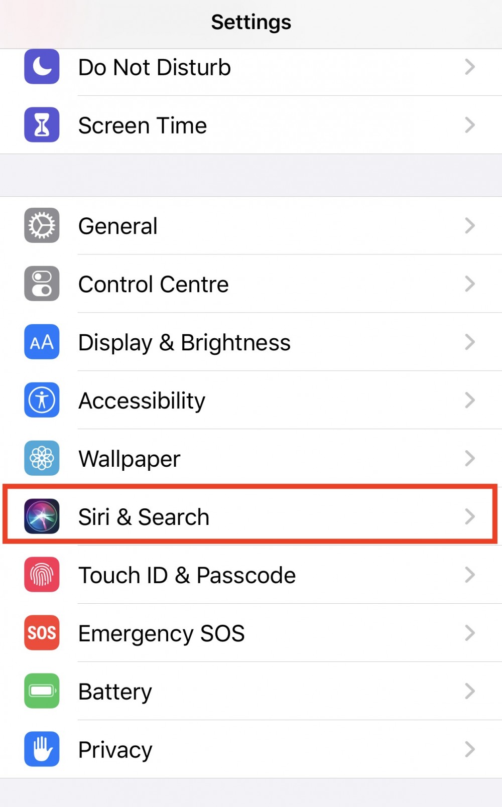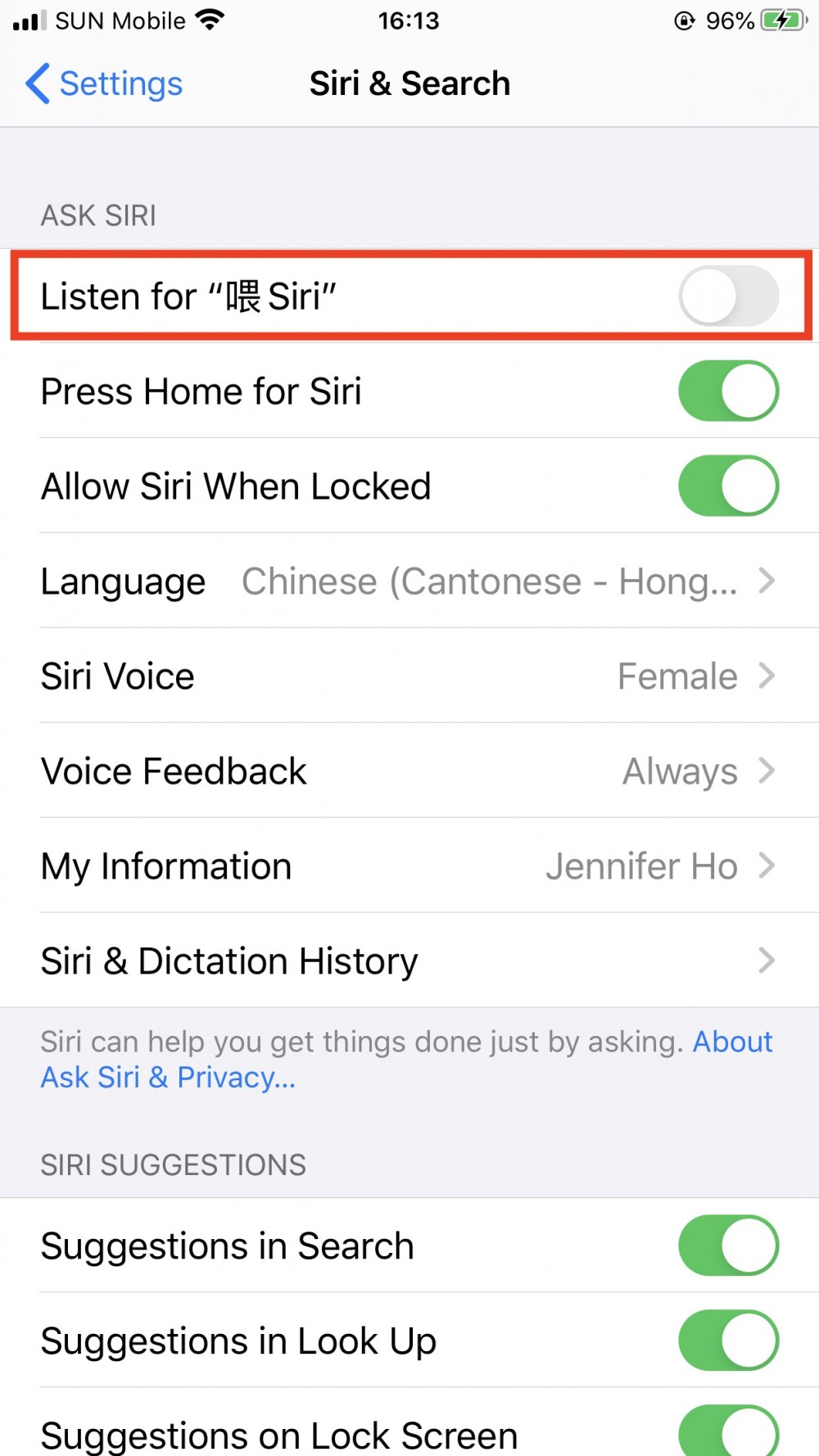 3. 拉上去「Siri 與搜尋」,關閉「聆聽『喂 Siri』」。