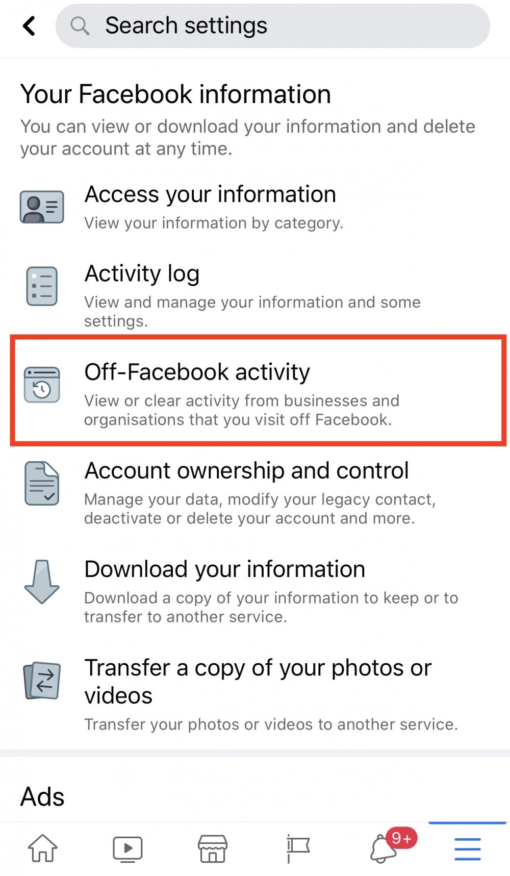 2. 向下拉至「你的 Facebook 資訊」,選「Facebook 站外動態」。