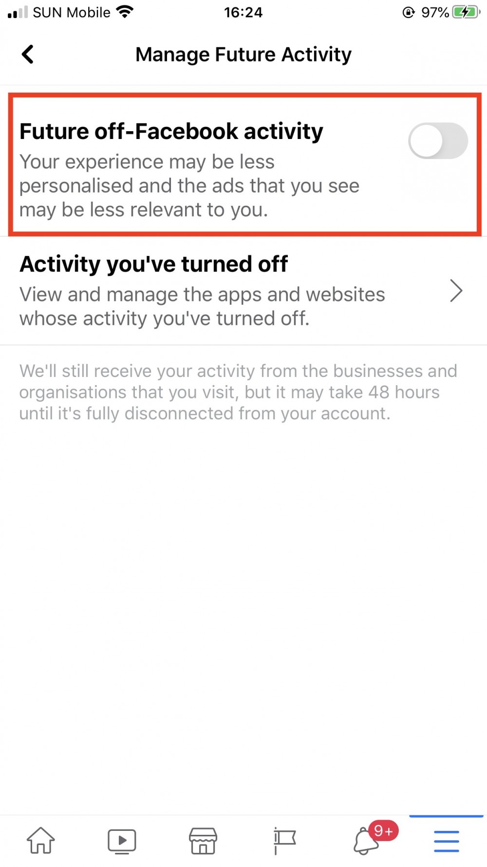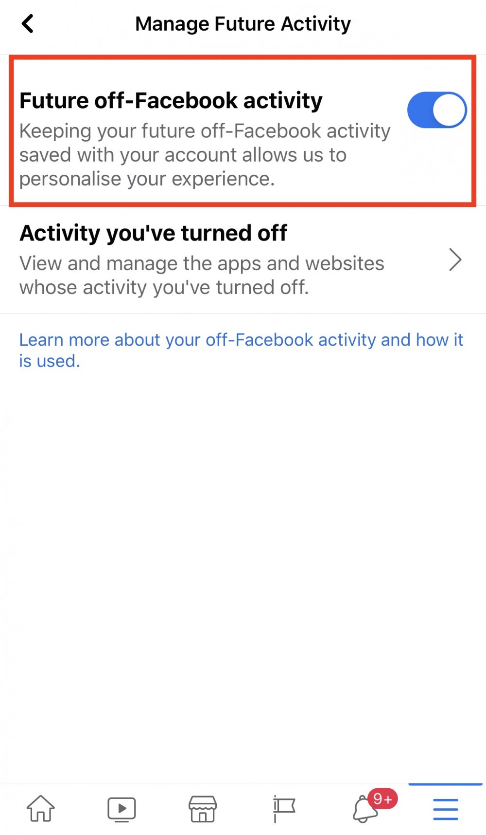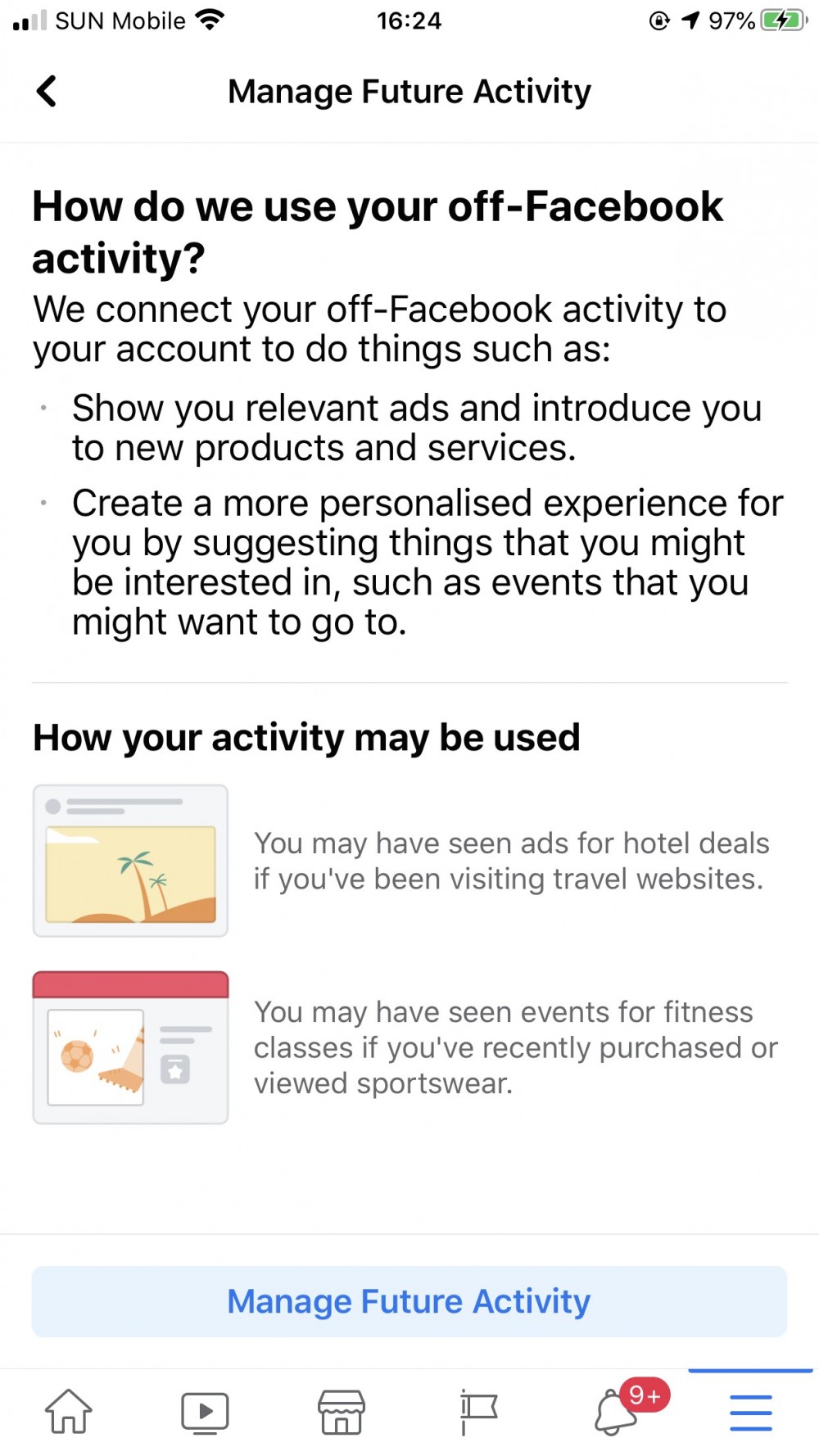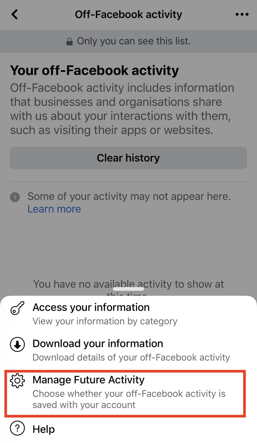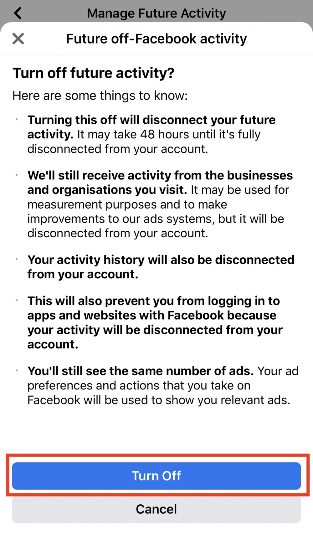 5. 之後選擇「管理你的 Facebook 站外動態」,撳「管理未來的動態」,再撳藍色「管理未來的動態」確認。