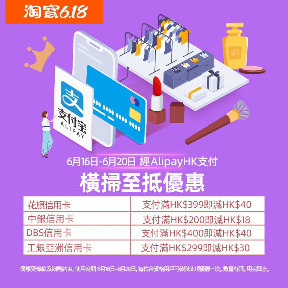 除咗免手續費,使用以下信用卡經 AlipayHK 結帳嘅話,仲有指定減價優惠: