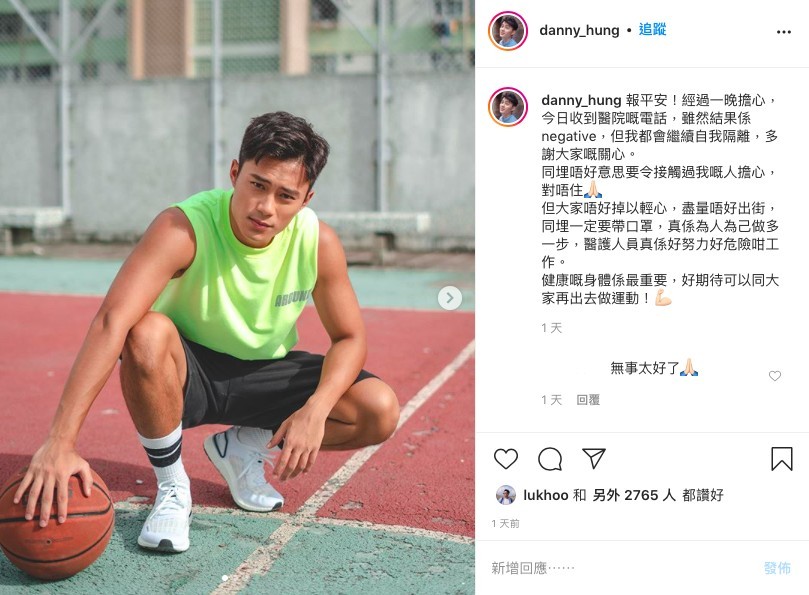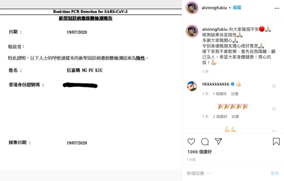 陸浩明(6號)亦做咗檢測,等咗兩日終於有結果, 測試係「陰性 Negative」。