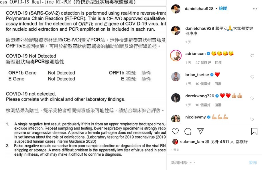 曾經同施匡翹一齊上戲劇班嘅戴祖儀亦公開檢測報告,佢表示:「我明白報告出咗,都唔等於100%冇事,我都會繼續在家隔離。」