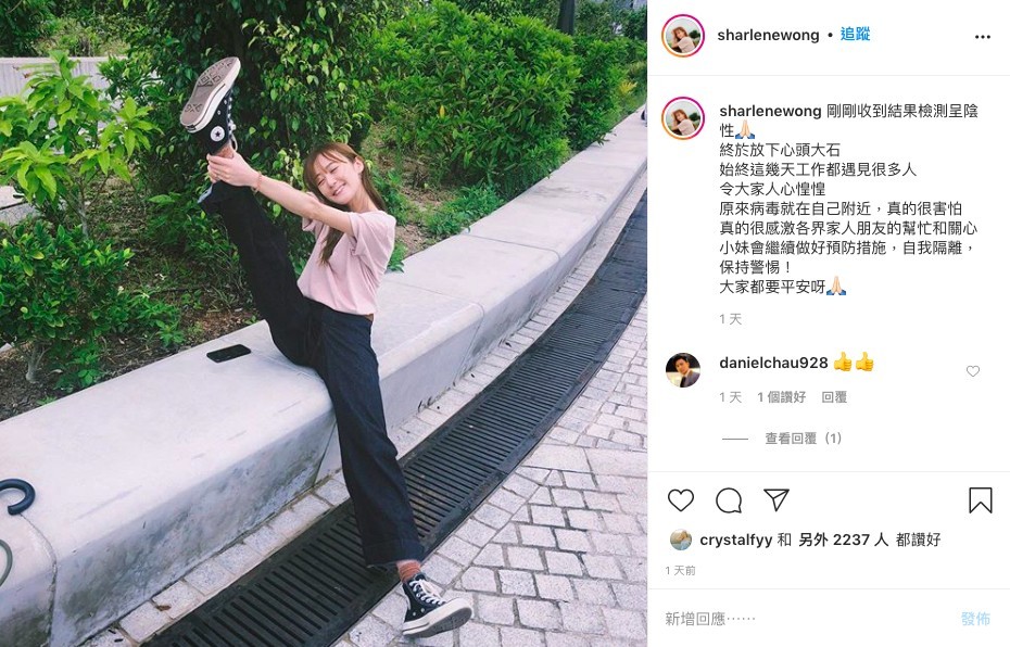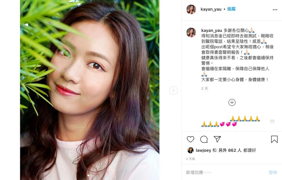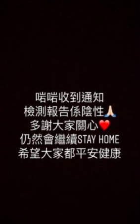 薛凱琪更曾同施匡翹貼頭合照,佢亦喺IG報平安:「剛剛收到COVID-19測試,結果出來是陰性」