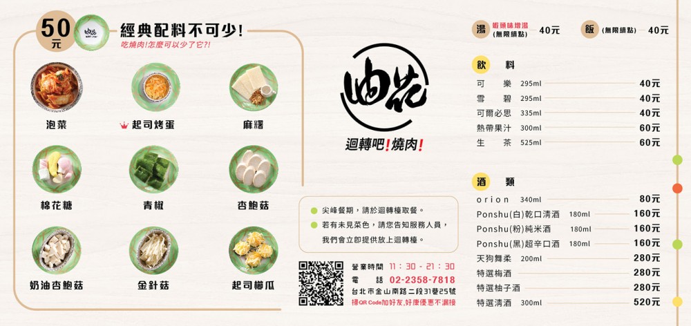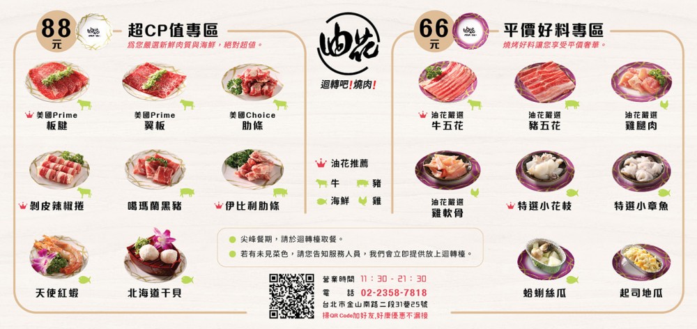 迴轉吧上除咗有基本嘅豬、牛、雞及海鮮外,仲有奶油金針菇、牽絲起司地瓜、烤麻糬等等,價位則分別是 $88 台幣嘅白色盤、$66 台幣嘅紫色盤同 $50 台幣嘅綠色盤3種,最低消費為每人 $200 台幣。