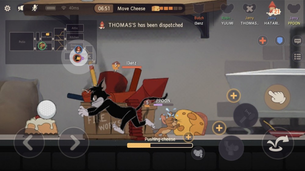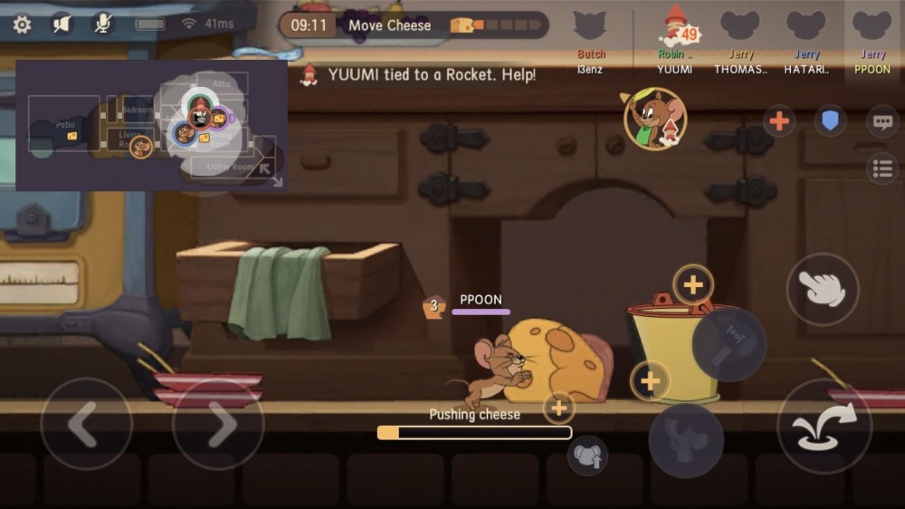 Jerry 的任務絕不簡單!找到芝士後,需要將芝士搬到其中一個預設的牆洞,然後把芝士塞進牆洞裡。此時,聰明的 Tom 玩家絕對會馬上跑來阻止你把芝士塞進牆洞啊!如果飾演 Jerry 的你見到其他老鼠伙伴正在塞芝士,記得一定要幫牠一把,越多老鼠一同塞芝士會更有效率呢!