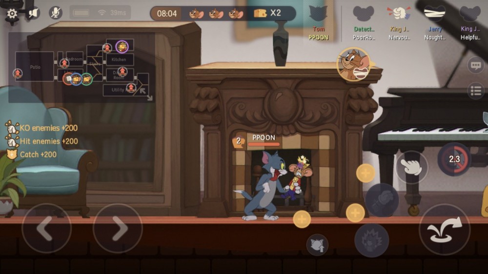 Tom 會隨時追上來攻擊 Jerry,Tom 以及 Jerry也可以選取家中的物件如玻璃杯、乓乒球、器皿等攻擊對方,Tom 更可放置捕鼠器,但當然自己踩中的話也會受傷啊(畢竟你也只是隻貓)!