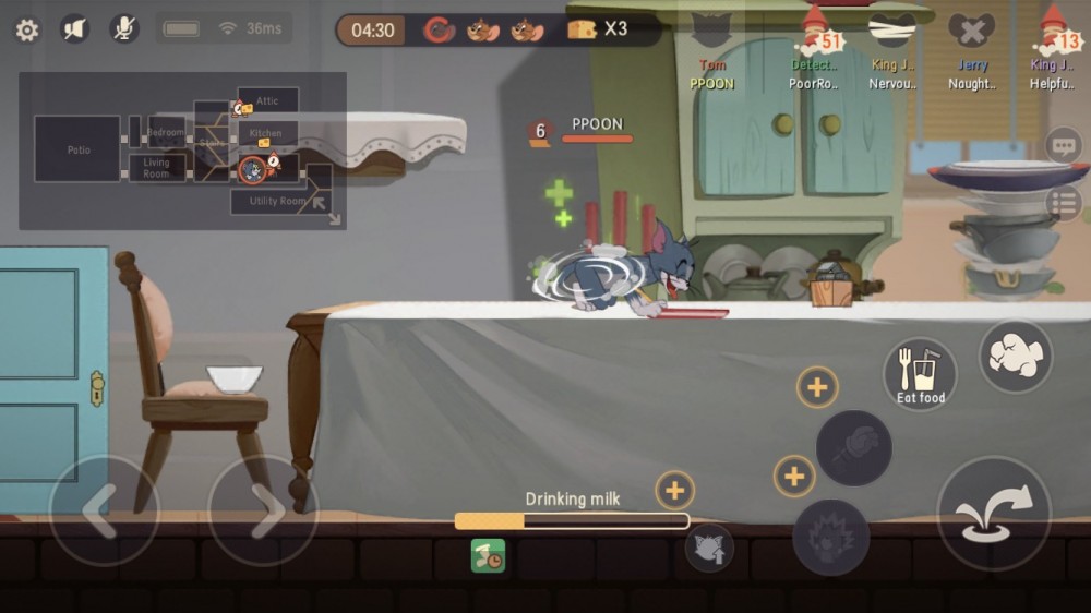 家中設有不同的水果盤以及牛奶碟,Tom 以及 Jerry 也可以隨時開餐,飽肚後便會走得更快啦!大家也可以將門關上,增長被敵方追趕的時間,但當然自己出入也會不方便啊!