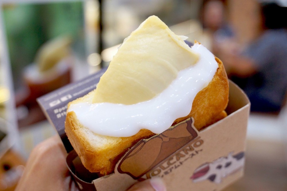 多士塗上軟滑榴槤蓉,烘得香脆,裡面放入塊核原粒金枕頭榴槤,再加入芝士同椰奶。