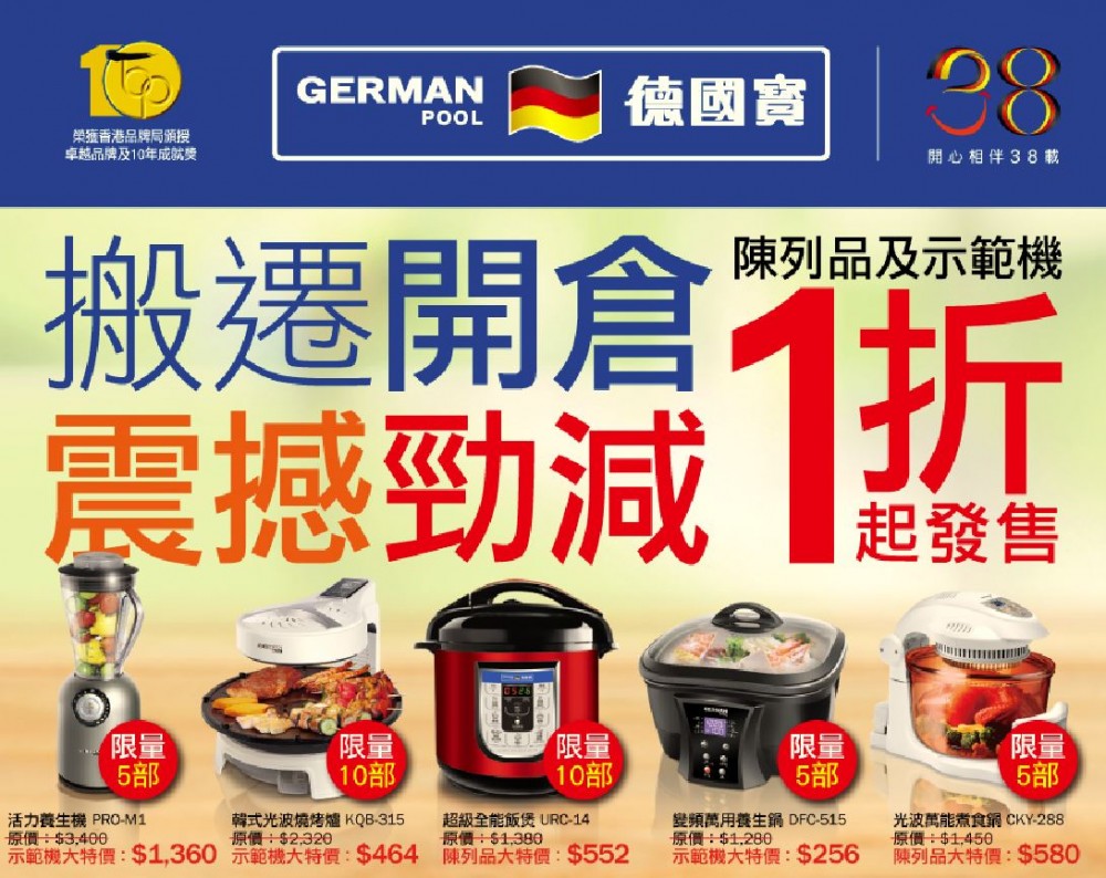 德國寶開倉啦!由即日起至9月20日期間,九龍灣德國寶舉行搬倉清貨大減價,大量示範機以及陳列品低至1折,而且限量發售,有興趣的朋友記得火速搶購!