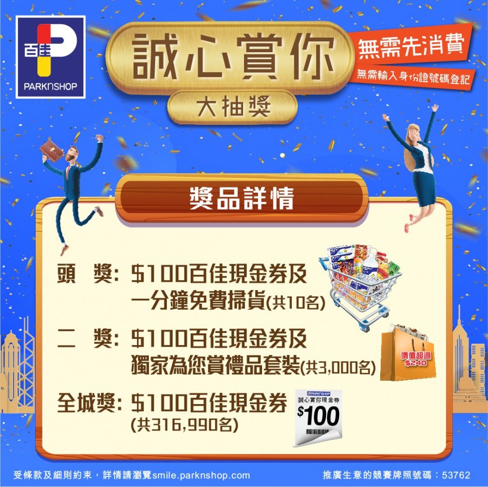 頭獎:$100百佳現金券及 1分鐘免費掃貨 (共10名)