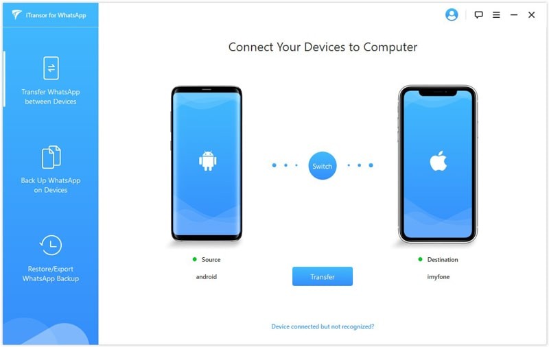 1. 在電腦上安裝iTransor for WhatsApp,然後執行應用程式。在主畫面左側邊欄選擇“在設備之間傳輸WhatsApp”。使用USB線將iPhone和Android裝置連接到電腦。該應用程式會偵測並顯示裝置。只需要按照銀幕上的說明操作。