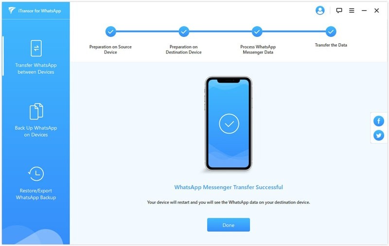 3. 在此過程中,請確保兩個裝置均有連到電腦上。 可能需要幾分鐘到幾小時的時間,具體取決於你的WhatsApp資料的多寡。該過程完成後,你就可以在Android裝置上看到WhatsApp的資料。