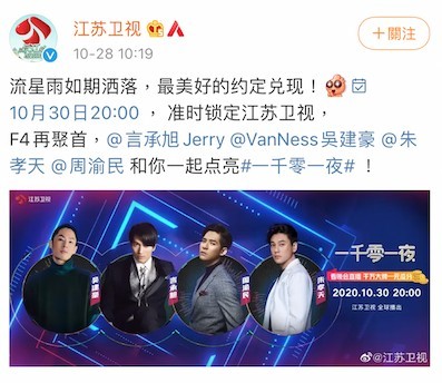 早前江蘇衛視宣布 F4 將於 10 月 30 日喺《一千零一夜》節目中合體獻唱,仲上傳咗四人嘅宣傳影片,令粉絲非常激動!今次都係 F4 時隔 7 年再次合體,對上一次係 2013 年江蘇衛視嘅春晚。