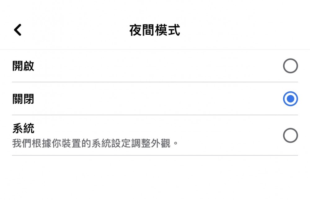2. 按「夜間模式」後,會出現「開啟」、「關閉」及「系統」。