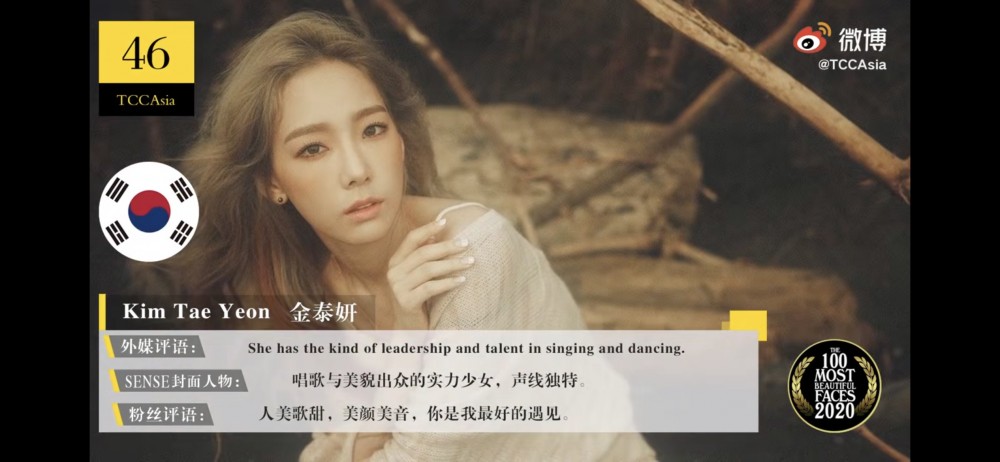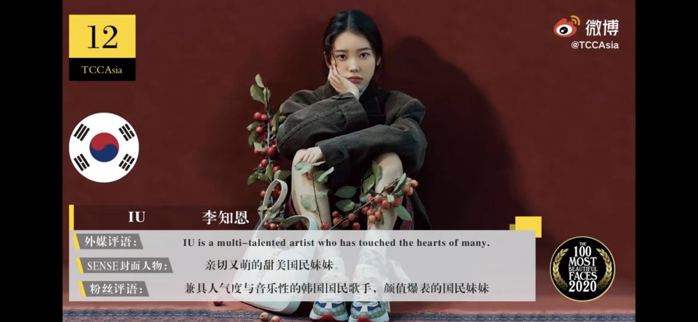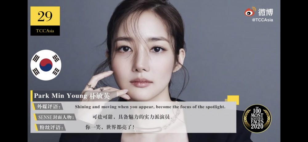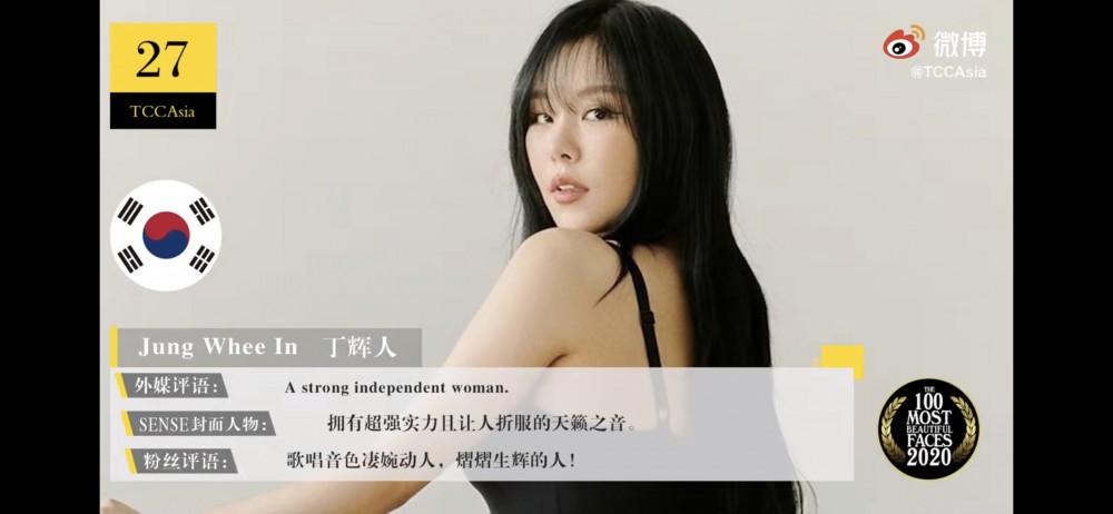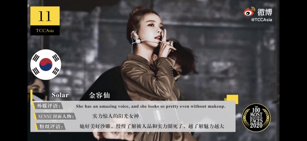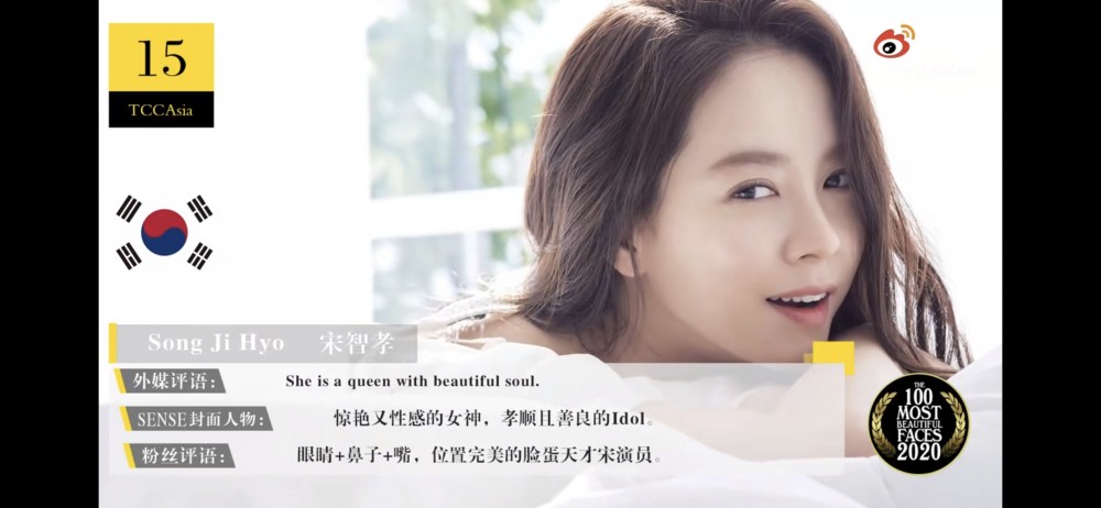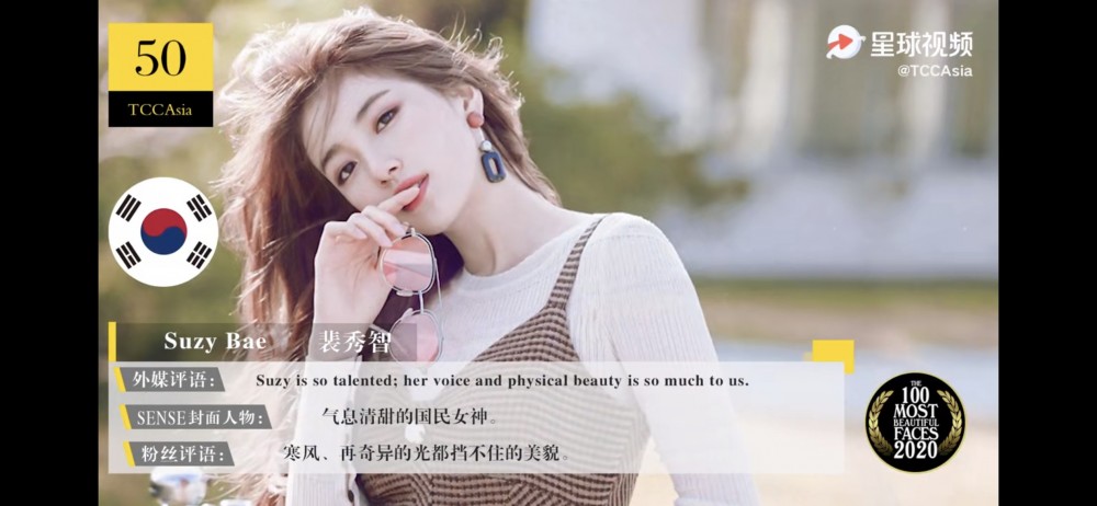 第 50 位:秀智;第 48 位:宋慧喬;第 46 位:泰妍;第 43 位:全智賢;第 37 位:鄭秀晶;第 34 位:朴信惠;第 30 位:楊冪;第 29 位:朴敏英;第 26 位:徐睿知;第 21 位:石原里美;第 20 位:MAMAMOO 成員華莎;第 19 位:孫藝真;第 16 位:允兒;第 15 位:宋智孝;第 12 位:IU;第 11 位:MAMAMOO 成員 Solar。