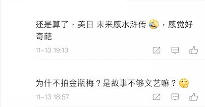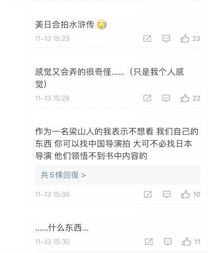 有網民表示可能會好似《花木蘭》咁,變成「翻車現場」,毀掉經典,亦有網民表示「能導出水滸的精髓?表示懷疑」、「外國人能完全理解水滸傳嗎」、「別拍出來毀三觀」等。