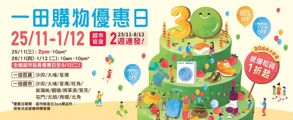 一田百貨踏入30週年,今年嘅一田購物優惠日為期7日,等大家可以盡情搶購!寢具套裝、護膚產品、超市美食、廚具、家居清潔用具、玩具衣飾及戶外運動服飾等都有優惠!