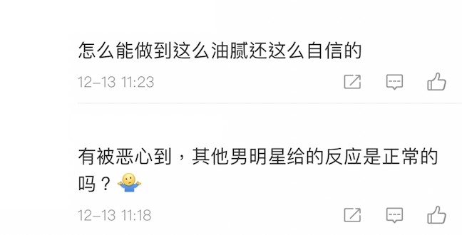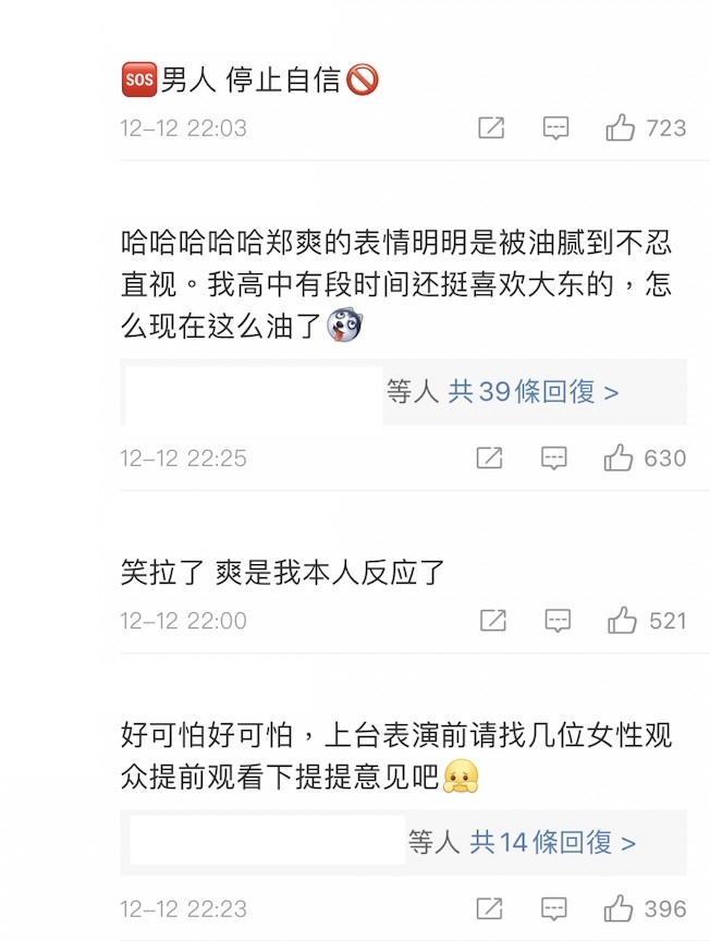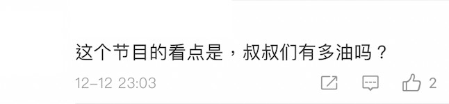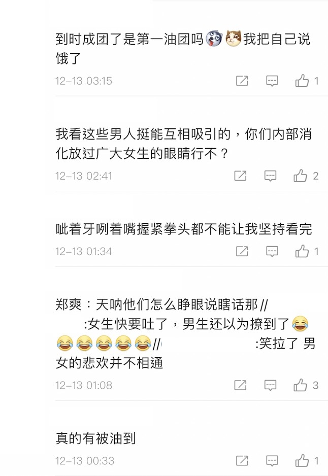 網民笑言「鄭爽的表情明明是被油膩到不忍直視」、「這個節目的看點是,叔叔們有多油嗎」、「所以他們為啥糊啊,油膩而不自知啊」、「到時成團了是第一油團嗎」。