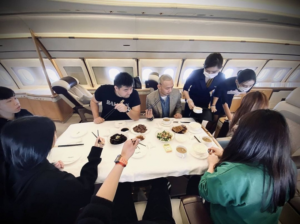 而且私人飛機內部裝修相當豪華,機艙闊落,有會議廳、客房等。佢更帶埋旗下藝人徐藝揚一齊搭~