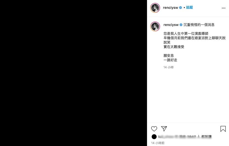 曾跟廖啟智學戲嘅藝人楊偲泳坦言難以接受,指數月前才與對方聚會:「您是我人生中第一位演戲導師,早幾個月前我們還在婚宴派對上聊聊天說說笑,實在太難接受,願安息。」
