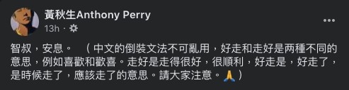 黃秋生在社交平台悼念並同時教大家喺寫上「一路好走」同「一路走好」嘅分別,提醒大家路好用錯:「智叔,安息。 ( 中文的倒裝文法不可亂用,好走和走好是两種不同的意思,例如喜歡和歡喜。走好是走得很好,很順利,好走是,好走了,是時候走了,應該走了的意思。請大家注意。? ) 」