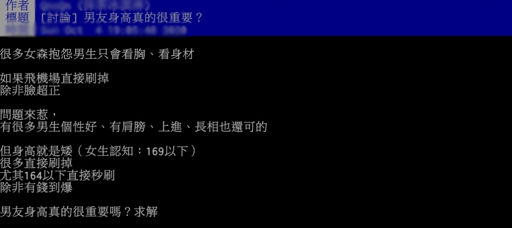 呢位台灣網友喺討論區表示根據自己嘅觀察,佢身邊大概 163 至 165 cm 左右高嘅朋友,都已經順利結婚生子,但反觀身高喺 160 cm 以下嘅朋友,喺感情上總係唔如意,唔係單身就係被飛。