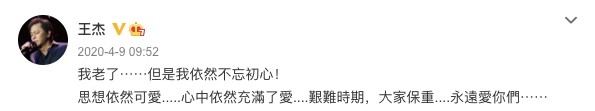 而喺加拿大定居嘅王傑,去年就喺其微博發文指自己老,但思想依然可愛,不過就並有附上任何照片:「我老了⋯⋯但是我依然不忘初心!思想依然可愛……心中依然充滿了愛……艱難時期,大家保重……永遠愛你們!」