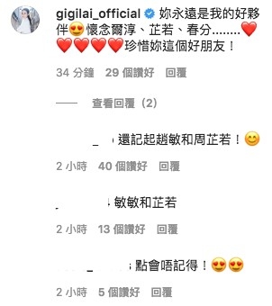 而除咗佢日前素顏慶祝好閨蜜生日外,今日佢又喺 IG 上傳同黎姿嘅合照留言:「That friend who you may not see very often, but the moment you reconnect feels like yesterday!@gigilai_official #一樣咁靚 #好友相聚 #金枝慾孽 #還記得金枝慾孽的玉瑩小主和爾淳小主嗎」