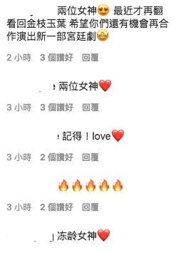 網民睇到都大讚佢兩位都係凍齡女神嚟,同話佢哋嘅代表作《金枝慾孽》係經典宮廷劇,希望佢地可以有機會再合作拍劇添!