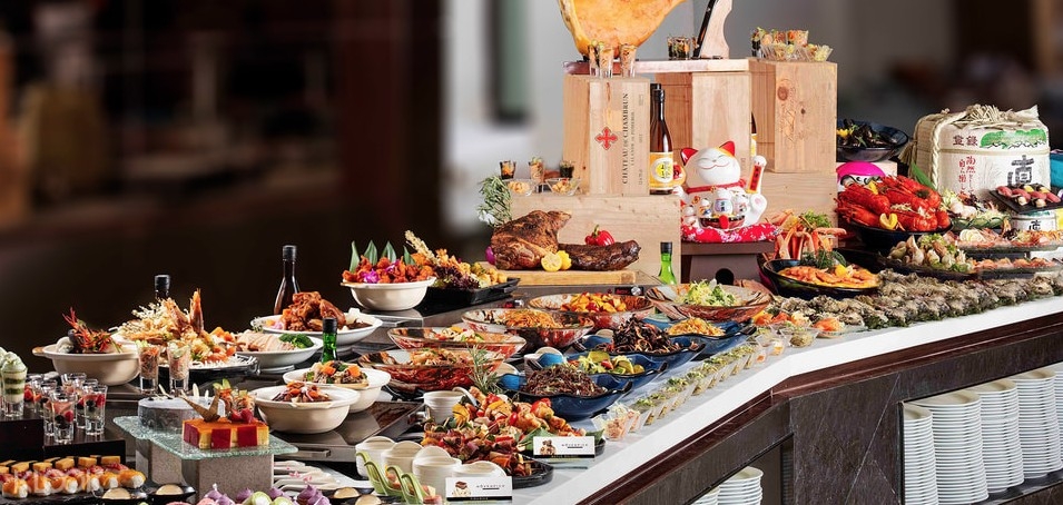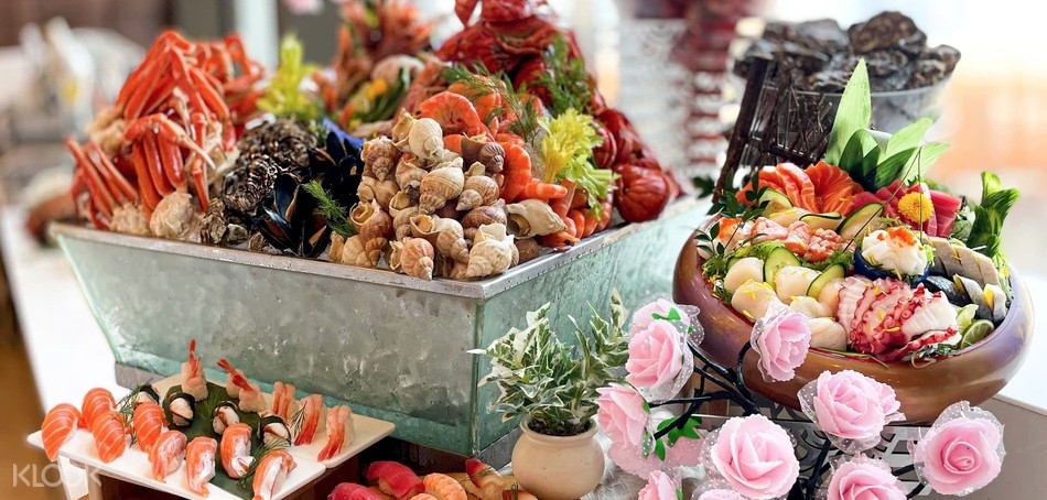 假日自助午餐提供多元化的國際美食,包括:生蠔、海蝦、海螺、青口、日式雜錦刺身、即製天婦羅、香草烤羊扒、牛肋骨、燕窩蛋白杏仁茶等,並無限供應的海鮮冷盤及甜品,讓您嘗盡融合多國特色的創意佳餚。