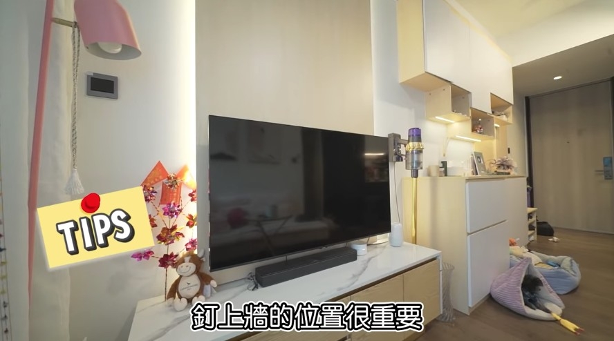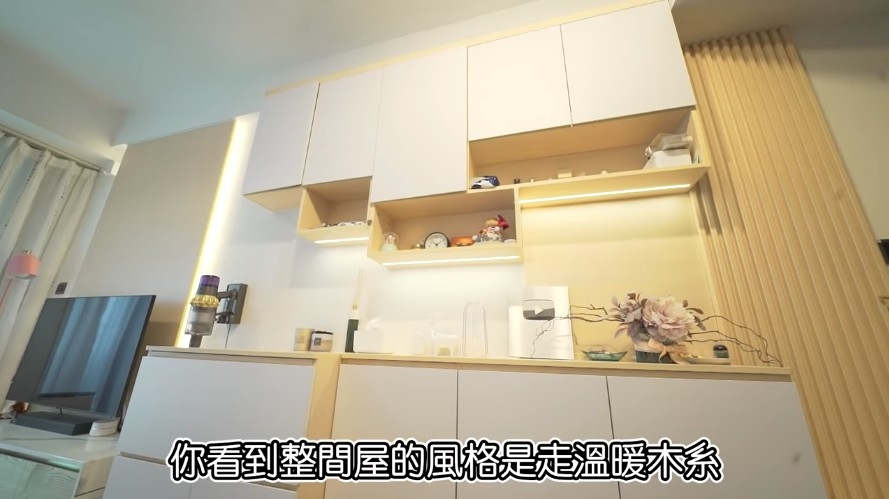 片中蔡嘉欣嘅蝸唔大,今次就介紹咗客廳、廚房同廁所,客廳以溫馨木系風格為主,傢俱與廚櫃等都是木色同白色,十分簡約,蔡嘉欣指:「我自己搵傢俱訂製公司,自己畫圖設計一啲傢俱出嚟。」並指新居多咗好多儲物空間,兩姊妹雖然有好多嘢,但睇起嚟都好整齊,明顯花咗唔少時間清潔。