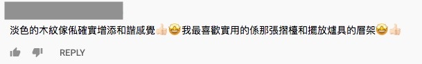 唔少網友就留言大讚蔡嘉欣嘅設計唔錯:「淡色的木紋傢俬確實增添和諧感覺,我最喜歡實用的係那張摺檯和擺放爐具的層架。」、「Kayan可以轉埋行做室內設計,期待下一條片!」更有網友喺佢片中見到好物後留言問喺邊度買添!