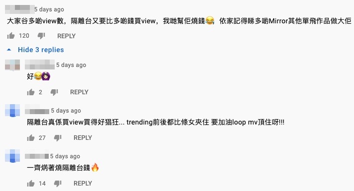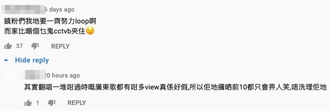 有唔少鏡粉號召大家loop MV:「大家谷多啲view數,隔離台又要比多啲錢買view,我哋幫佢燒錢」、「鏡粉們我地要一齊努力loop啊」、「有冇人係日日夜夜,返工返學,放工放學無限reloop只為衝高view數」