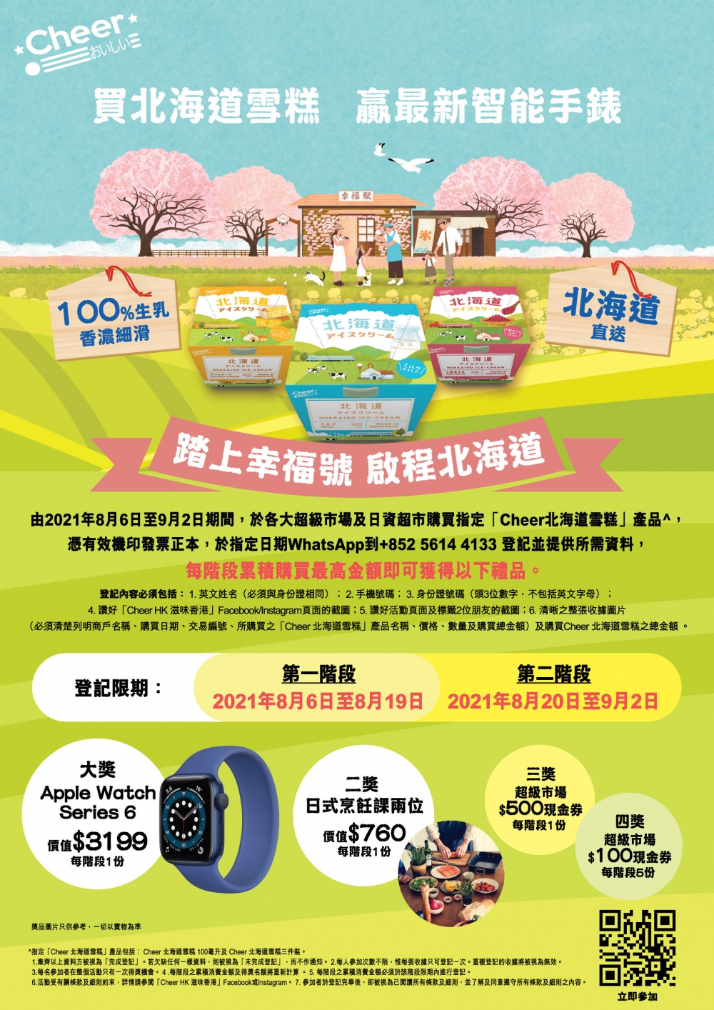 睇完小編介紹,係咪忍唔住想即刻買嚟試吓?8月6日至9月2日去各大超級市場買指定「Cheer 北海道雪糕」產品^,憑有效機印發票正本,再WhatsApp到56144133登記+提供資料,喺每階段累積最高金額就可以攞到Apple Watch/烹飪課/超市禮券!詳情可以去 https://qrd.by/cheersummer21 睇吓~快啲拉埋朋友/另一半去掃貨啦!