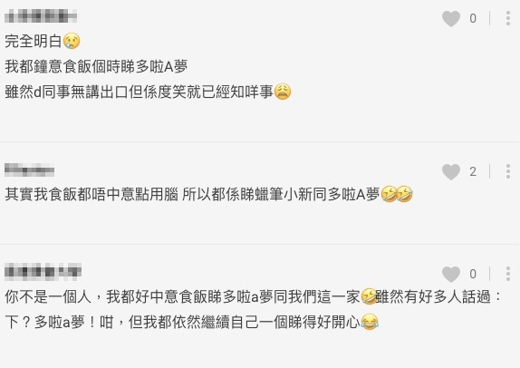 有唔少網友都表示自己好中意睇卡通片:「我平時食飯都配蠟筆小新」、「終於搵到同好!!我食飯鍾意睇花師奶同小丸子」,指食飯就係要睇啲唔洗用腦嘅卡通。