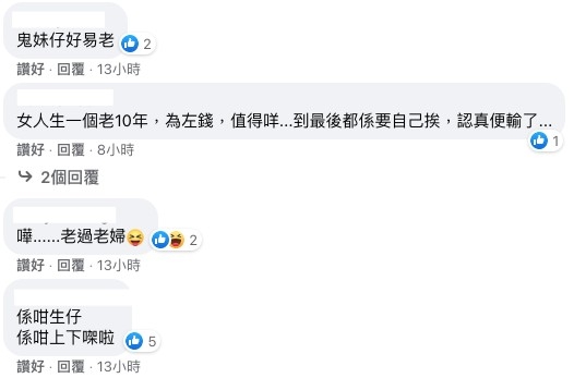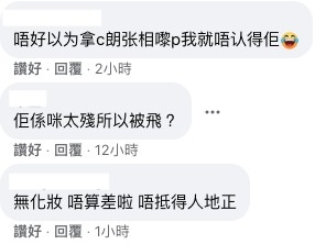 有唔少網友都指因為Mandy Lieu係外國人比較易顯老:「其實大婆一直整體靚過佢,無論樣同身材」、「佢係咪太殘所以被飛?」、「皮膚好乾下」,不過亦有人認為佢生咗4個小朋友,變殘好正常:「五年生四個呀大佬,想唔殘都難啦」、「生左4個,好ok啦,係頭髮少左」。