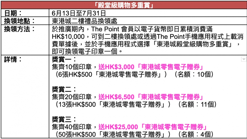 連埋壓軸加推嘅「殿堂級購物多重賞」,回贈高達HK$25,000!於場內消費滿HK$10,000,即獲電子印章一個,儲滿指定數量印花,即送唔同面額嘅東港城零售電子贈券,回贈高達HK$25,000!