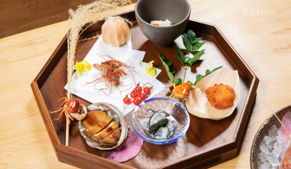 包含前菜、名物生蠔、刺身5點、定番海膽杯、時令蟹、吸物、燒物和牛薄燒/逸品喜之次(二選一)、甜品