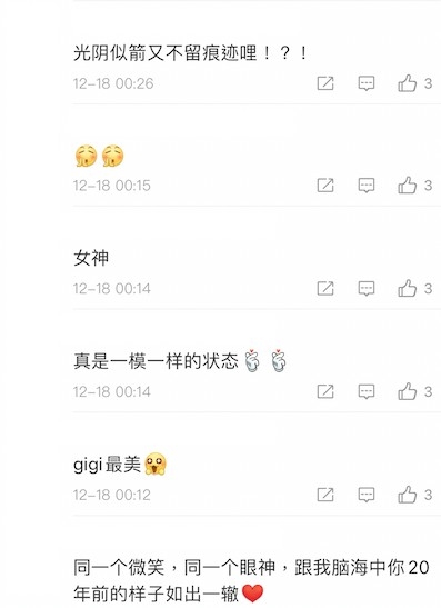 相中嘅梁詠琪同專輯封面一樣著住黃色衫,一樣嘅短髮、笑容,44 歲嘅佢同 20 年前一樣,依然咁靚,好多網民一睇到張相都大讚 Gigi 冇變過,「20 年過去了,還是沒甚麼變化,依舊那麼年輕漂亮」、「20 年前後無區別,這是吃了防腐劑吧,你說是同一天拍的我都信」、「幾乎沒變,一樣自然清純的美」、「唯一改變的是時間卻還沒改變容顏」。