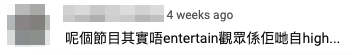 有網民就覺得係主持同嘉賓嘅問題,認為雙方互動都冇火花,所以玩小遊戲都唔好睇:「得個嘈字」、「呢個節目其實唔entertain觀眾係佢哋自high...」。