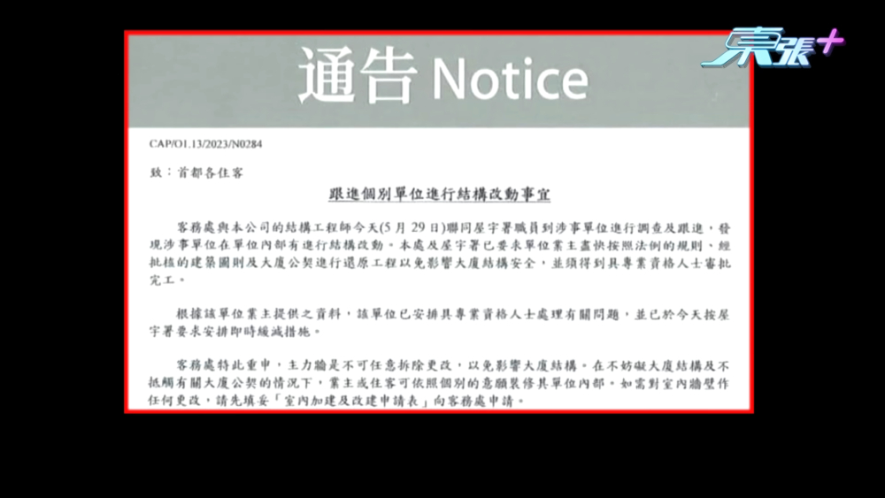 有關片段事後被刪,但事件於網絡上不段發酵,屋宇署前日(29日)於涉事單位進行調查,證實單位涉及違規情況,據知,有關單位嘅業主態度合作,已主動安排承建商於新門橫樑下安裝臨時支架,暫時分擔失去部分主力牆造成嘅危險。