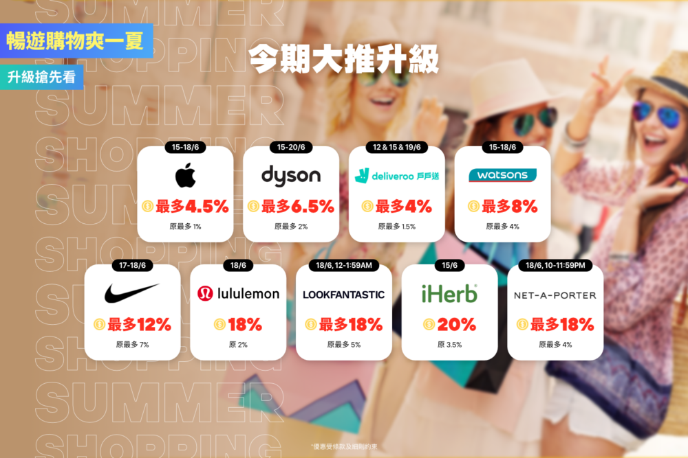 ShopBack每月都會跟不同商戶有所合作,當中一些特選商戶回贈的比率更會特高,嚟緊嘅6月15-18日更會有升級現金回贈,準備出發去買機票酒店嘅朋友千萬不要錯過!