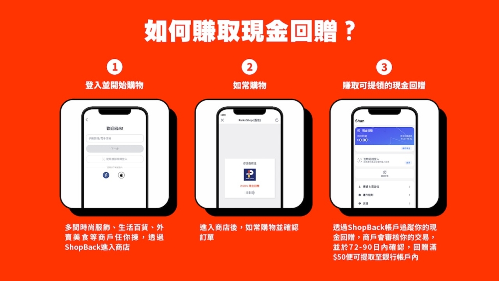 覺得好複雜唔知應該點做好?首先只要你下載ShopBack App或者上網頁登記成為會員之後,於程式入面揀選你想購物嘅商戶進入商店,如常地購物並且確認訂單,ShopBack就會透過你嘅帳戶去追蹤交易,審核成功之後48小時內就會轉帳去到ShopBack 帳戶,只要帳戶內累積的現金回贈達到$50,就可以即時將現金提取去到自己的銀行戶口。
