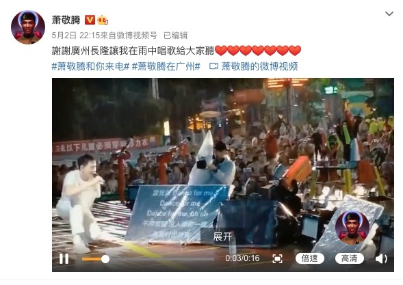 唔少人都知歌手蕭敬騰向來有「雨神」嘅封號。而近日佢就去咗電音節任演唱嘉賓,話晒「雨神」出門又點會唔落雨喇.....而依個雨量仲搞到大家忍唔住要去佢微博留言請佢盡快離開廣州。