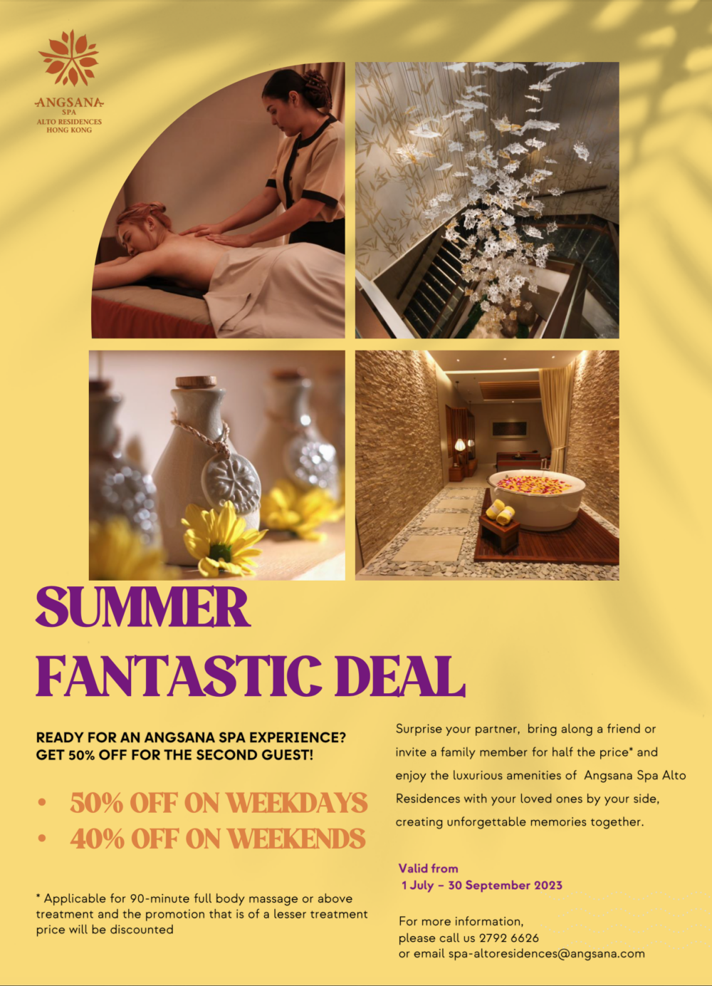 #由2023年7月1日至9月30日期間,二人同行惠顧藍塘傲悅椿90分鐘全身按摩或以上療程,第二位顧客即可獲六折優惠(星期六、日或公眾假期除外)平日惠顧,第二位顧客優惠更高達半價。