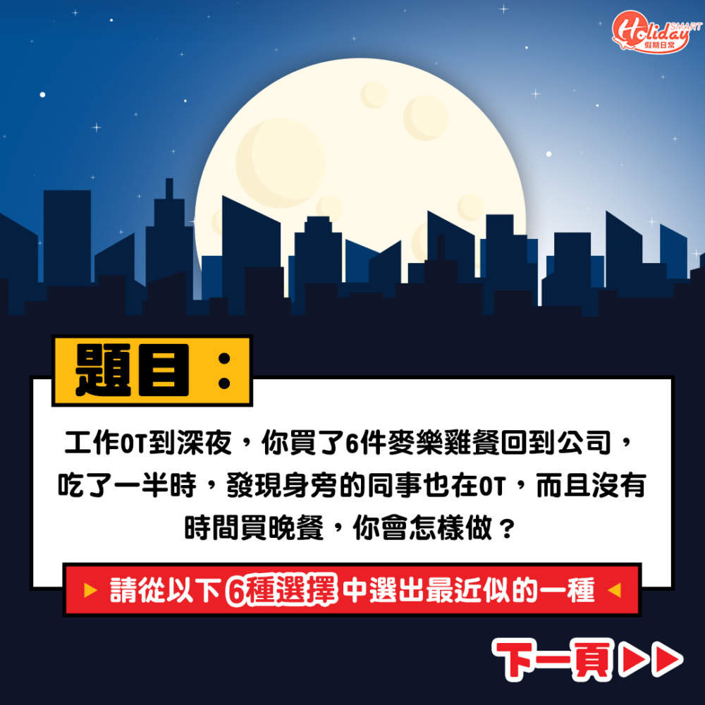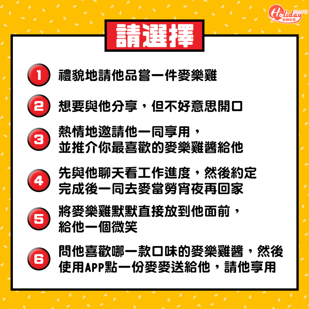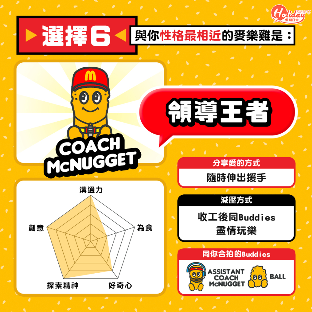 來到麥樂雞40週年這個大日子,現在就讓我們展開一個有趣的麥樂雞心理測驗之旅!只需花上1分鐘的時間,就能揭開你與麥當勞的麥樂雞角色最相像的神秘面紗!在職場中,每個人都扮演著不同的角色,你又會是其中的哪一種呢?