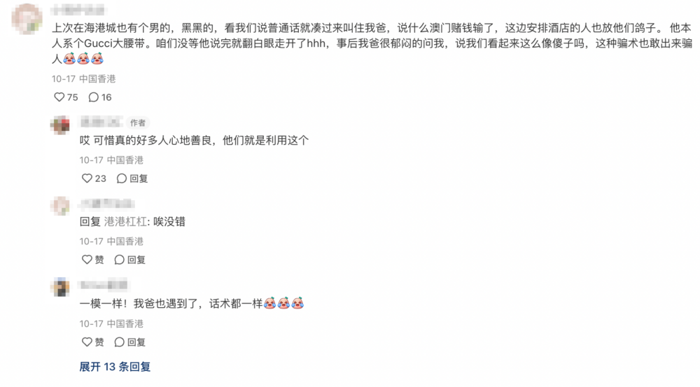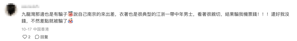而最後事件以兩個騙子看網友報警後,便直接邊罵邊跑告終。而對此網友就表示感到十分心寒,只因她認為是因為自己當時說普通話才會被當成行騙目標,而且該兩名騙子亦是內地人,更讓她有種「中國人只騙中國人」的感覺。同時亦有不少網友於帖文下留言分享類似的遭遇,有人指曾在海港城遇上一名戴Gucci腰帶的男騙子,稱自己「澳門賭錢輸了,這邊安排酒店的人也放他們鴿子」要求借錢。亦有人指自己在九龍灣亦遇到一名自稱從南京來香港出差的騙子,要騙取機票錢,可見騙徒手法層出不窮。