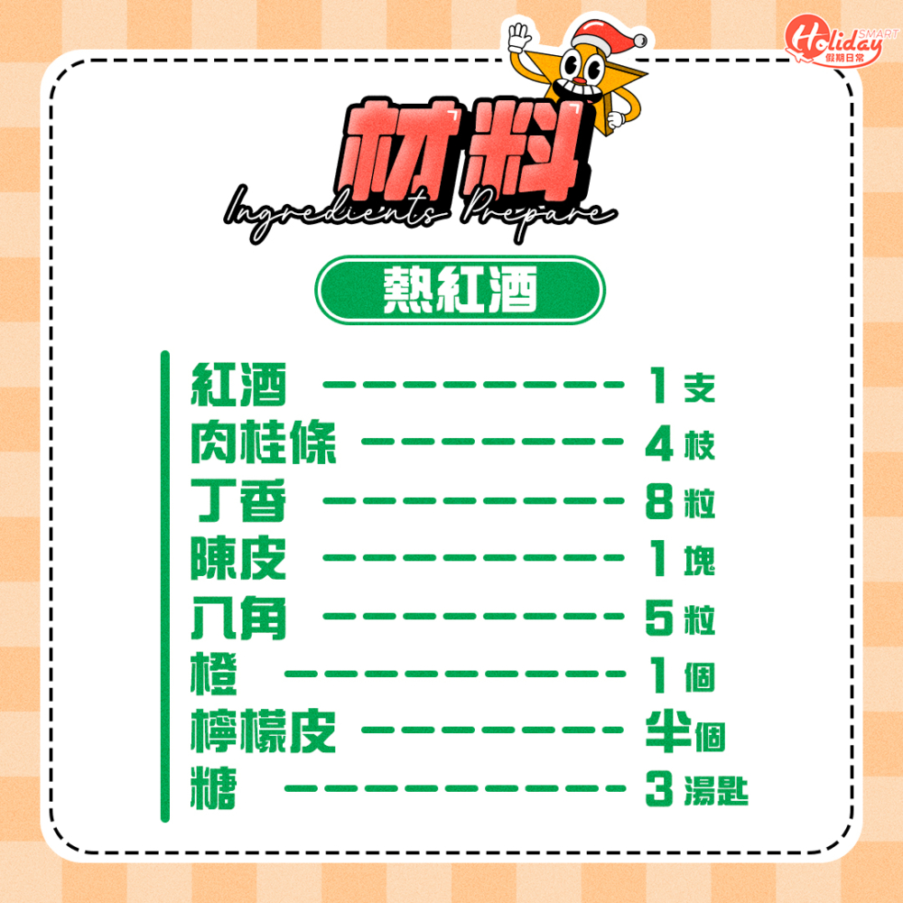 | 3. 將肉桂條、八角和橙皮加入煲中,加入黃糖,收細火煲20分鐘,隔渣,在杯中加橙片裝飾。 |