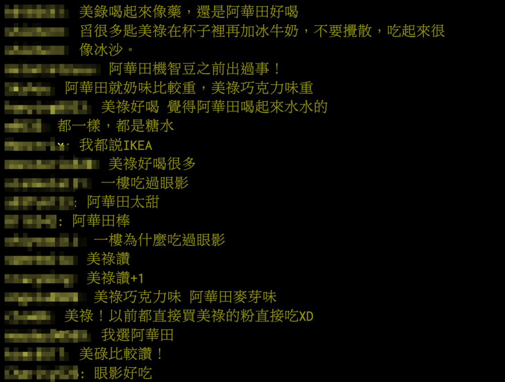 帖文一出,馬上掀起網友的熱烈討論,還明顯分成了阿華田派以及美祿派兩種不同的派別,表示:「都是快樂的泉源」、「差在名字不一樣」、「美祿超好喝,跟阿華田完全不同口味」、「美祿喝起來像藥,還是阿華田好喝」。同時也有不少人認為是朱古力味跟奶味的差別,「美祿有巧克力味,阿華田比較淡」、「阿華田就奶味比較重,美祿巧克力味重」、「阿華田比較像麥芽可可,美祿則是巧克力牛奶」、「美祿巧克力味,阿華田麥芽味」。